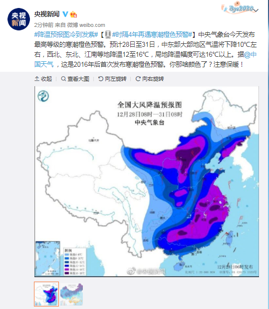 中央气象台今天发布最高等级的寒潮橙色预警。预计28日至31日,中东部大部地区气温将下降10℃左右,西北、东北、江南等地降温12至16℃,局地降温幅度可达16℃以上。据@中国天气 ,这是2016年后首次发布寒潮橙色预警。你那啥颜色了?注意保暖!