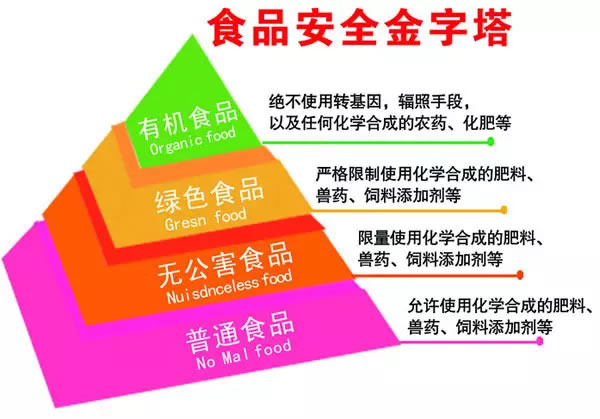 从食品安全级别上讲,无公害食品是基本档次,A级绿色食品是第二档次,AA级绿色食品和有机食品为最高档次。通俗地讲,有机食品是精品,绿色食品是优良品,无公害食品是普及品,三者间的关系可以形象地用金字塔形状来表示。如下图: