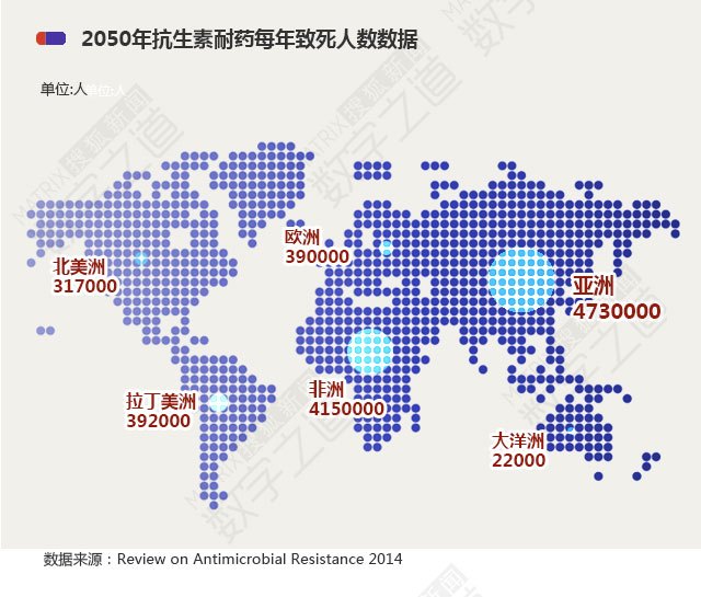 如果目前的情况得不到改善,到2050年,全世界每年或将有1000万人因为抗生素耐药性(AMR)问题死亡。作为世界上滥用抗生素最严重的国家,中国每年或将有100万人因此死亡,损失20万亿美元。这个数字远超过了交通事故、糖尿病和霍乱致死人数,甚至将超过癌症。